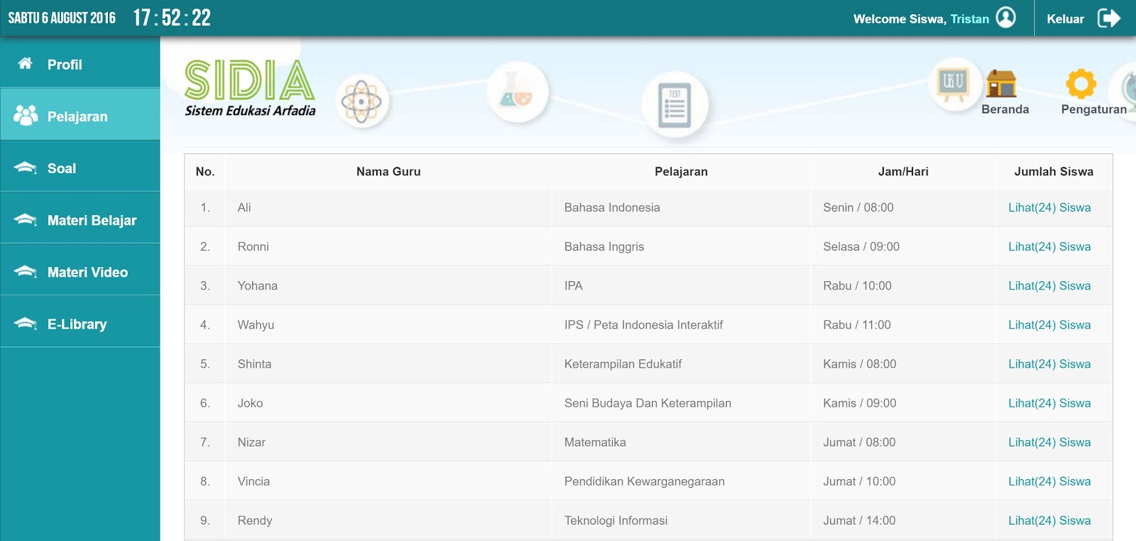 Tampilan Menu Pelajaran Siswa